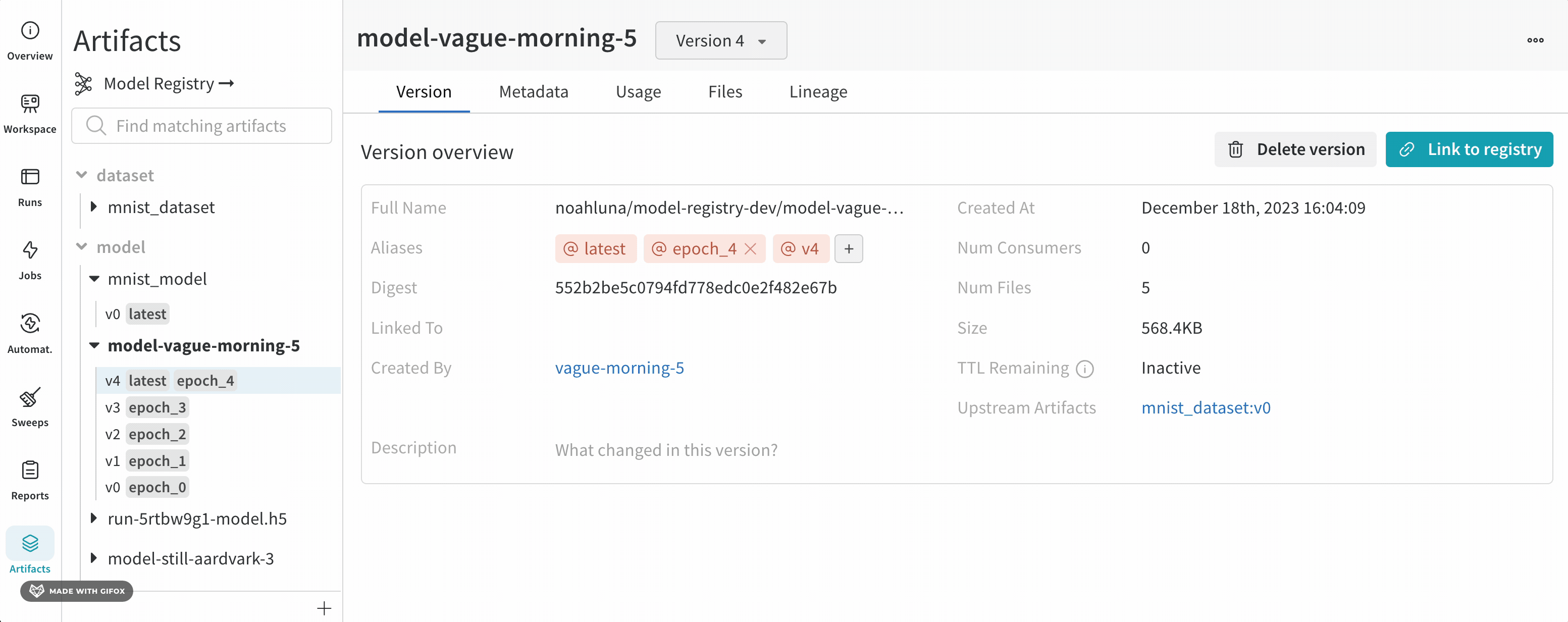 リンクされたモデルのソースを表示する方法は2つあります: モデルがログされているプロジェクト内のアーティファクトブラウザと W&B モデルレジストリです。 モデルレジストリ内の特定のモデルバージョンを、(そのモデルがログされているプロジェクト内に位置する)ソースモデルアーティファクトと接続するポインタがあります。ソースモデルアーティファクトにもモデルレジストリへのポインタがあります。